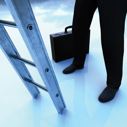 A businessman at the base of the corporate ladder. 3D render with HDRI lighting and raytraced textures.