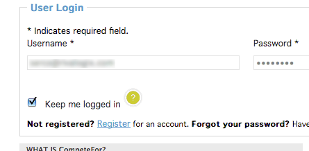If you have forgotten your CompeteFor password, you can request it is reset by entering your email address in the 'username' field on the Login Page and then clicking on the "Forgot your password? Have your Password Security Question emailed to you" link.