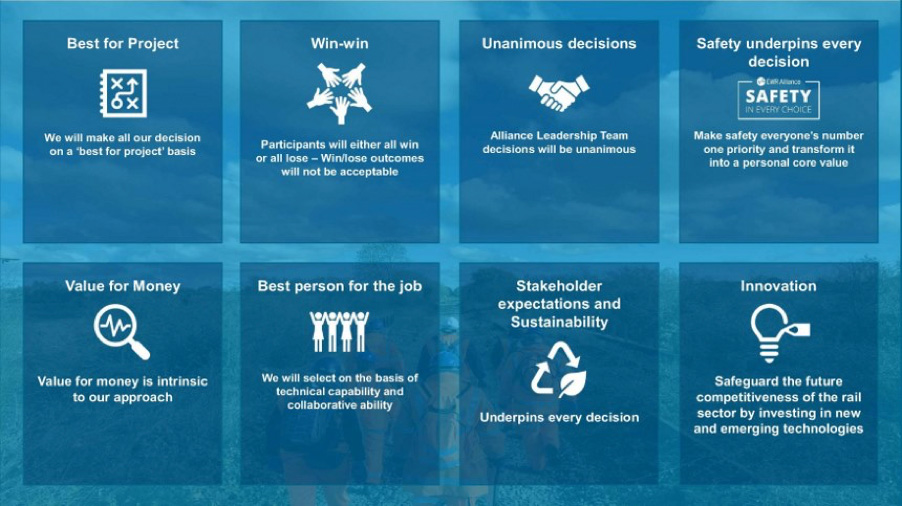 - Self-delivery – the Alliance will self-deliver certain packages directly via the companies involved in the Alliance: Atkins, Laing O’Rourke, Network Rail and Volker Rail (the Alliance participants)