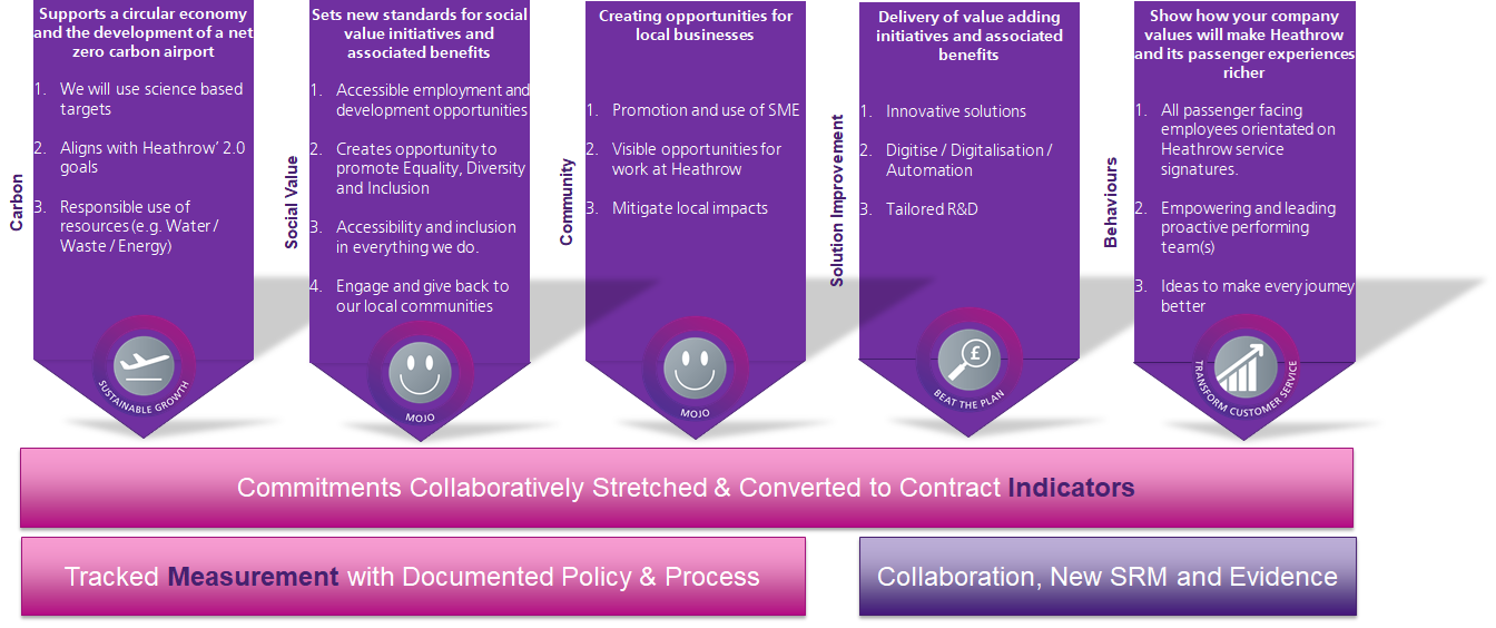 Procurement for Value: ensure Heathrow is procuring for value by implementing a Balanced Scorecard to identify and illustrate what is valued from the airport’s supply chain, including the use of SMEs and local businesses.